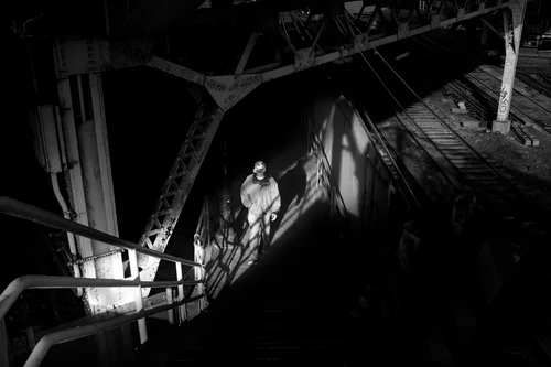 Rarely able to see the sky, these workers live in the shadows of bridges, scaffolding, and overhanging steel. We don’t know who these men and women are or who will greet them when they reach home. All we know is their work and commute are part of a tedious routine. Heads dipped, moving on automatic, their lives so repetitive they have no real memory from one day to the next.
